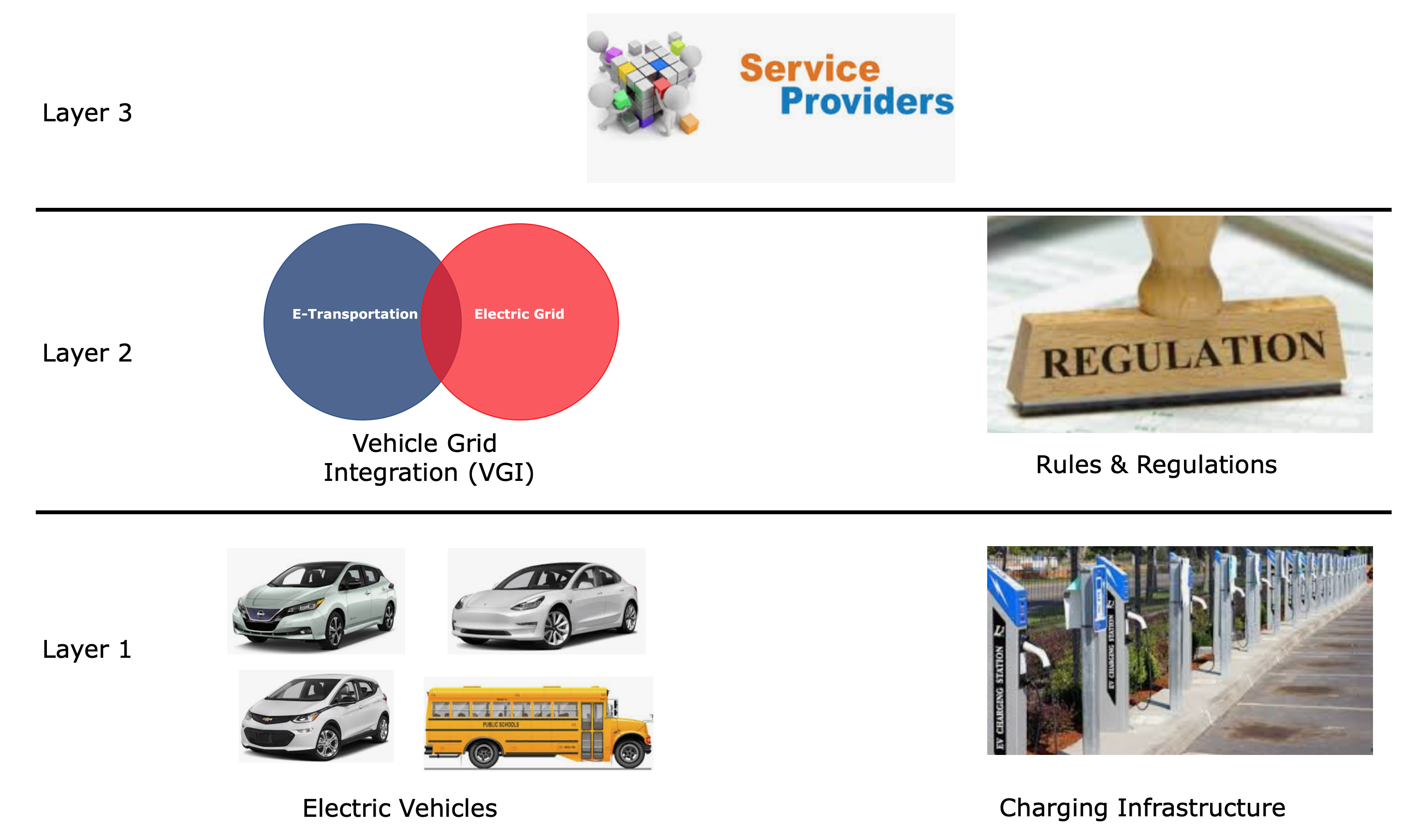 Layer 2 is that of intelligently integrating the electric transportation sector with the electric grid through smart standardized communications protocols . This is known as Vehicle Grid Integration (VGI). This layer also consist of rules and regulations to make the two sectors work in harmony.
